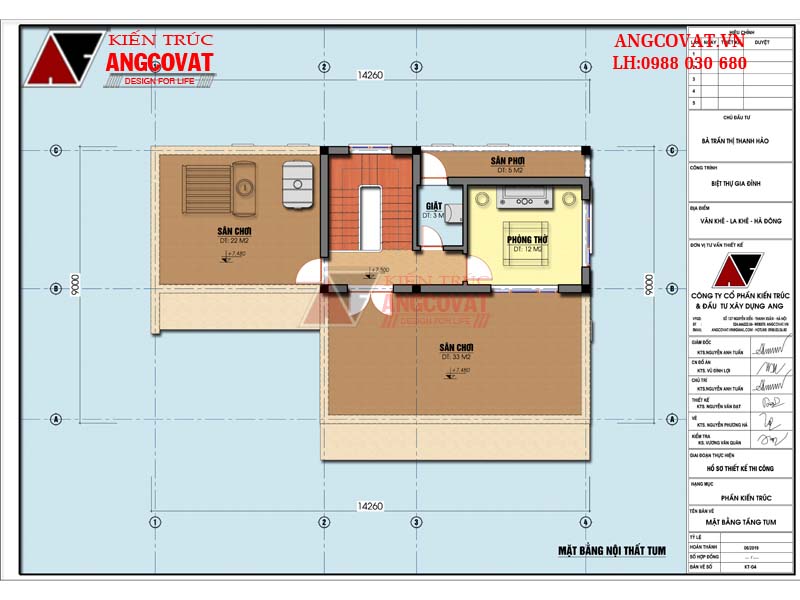 * Tầng tum: Phòng giặt: 3m2, Phòng thờ: 12m2, sân phơi: 5m2, Sân chơi: 33m2, Sân chơi ( khu vực téc nước): 22m2.
