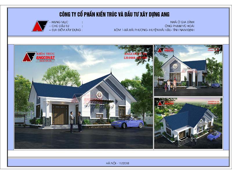 Ông Hoài tìm gặp chúng tôi vào tháng 10 năm 2018 với nhu cầu thiết kế ngôi nhà vườn 1 tầng 100m2 ở quê phục vụ cho nhu cầu nghỉ dưỡng. Theo đó yêu cầu của ông đối với ngôi nhà khá đơn giản: mẫu nhà 1 tầng 3 phòng ngủ 100m2, mái thái, phong cách hiện đại, đơn giản, ngoài ra sẽ bố trí thêm phòng khách và bếp ăn làm không gian quây quần, sum họp của các thành viên trong gia đình, đặc biệt khi con cháu về thăm. Tiếp nhận yêu cầu của chủ đầu tư, sau khi ký kết hợp đồng thiết kế, chúng tôi cũng đã cử người về tận nơi để khảo sát lô đất của gia đình và từ cơ sở đó cũng như những yêu cầu trên đưa ra sự tư vấn và bộ hồ sơ hoàn chỉnh, hợp lý nhất.
