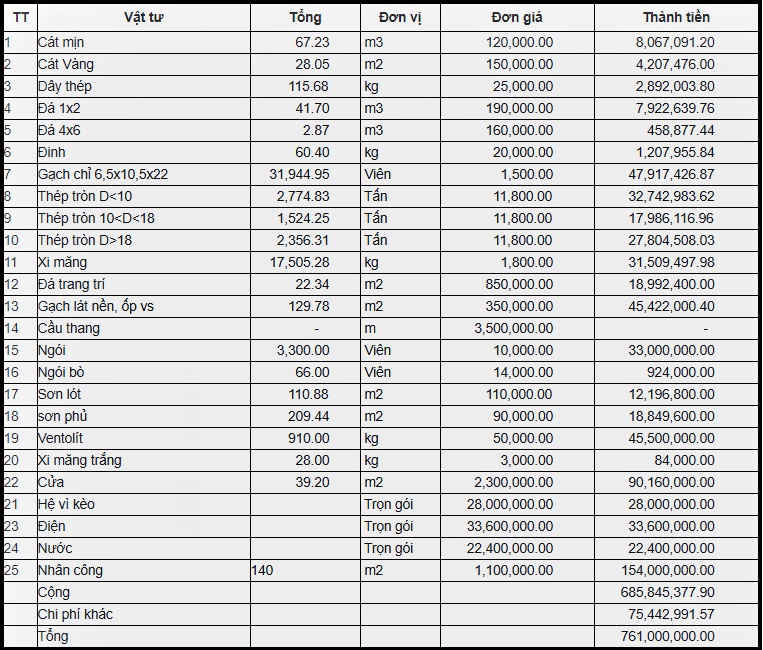* Đơn giá trung bình xây dựng cho công trình này: 5.435.714.29 (triệu/m2)