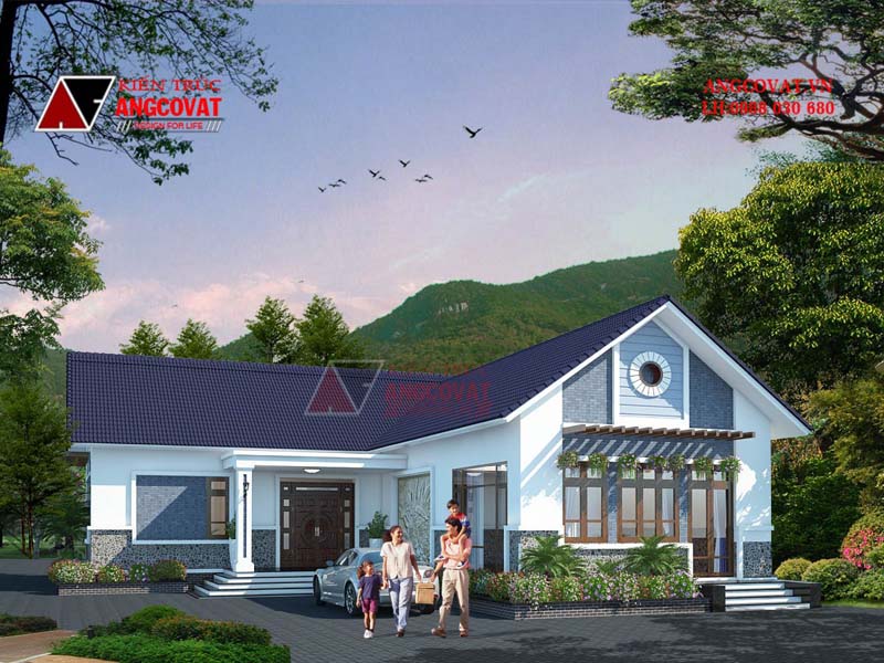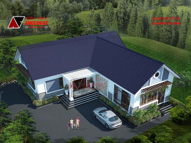 Thiết kế biệt thự nhà vườn 1 tầng 220m2 ấn tượng đến từng đường nét. Có thể thấy, đây là mẫu biệt thự có sự kết hợp hài hòa với sân vườn, hồ nước. Nhìn vào phối cảnh ngoại thất ta thấy được các hình khối kiến trúc nhà hình chữ L thông thoáng được kết hợp ăn ý với mái thái màu xanh lam hiện đại.