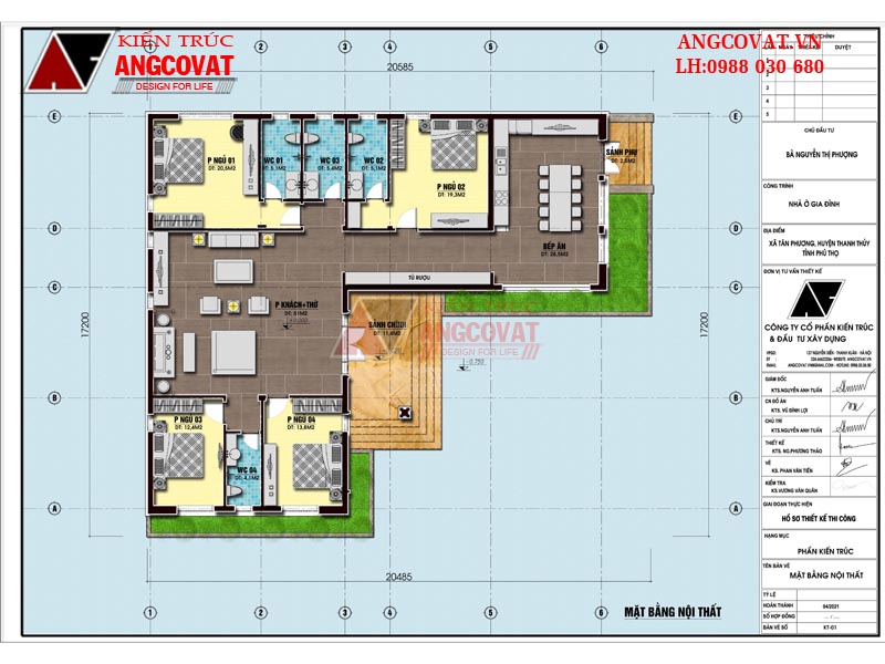 - Thông số các phòng: sảnh chính: 11,4m2; phòng khách + thờ 51m2; phòng bếp ăn 28,5m2; Phòng ngủ 1: 20,5m2; WC1: 5,1m2; WC2: 5,1m2; WC3: 5,4m2; Phòng ngủ 2: 19,3m2; sảnh phụ: 2,5m2; phòng ngủ 3: 12,4m2; phòng ngủ 4: 13,8m2; WC4: 4,1m2;