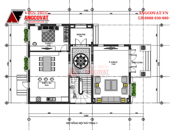 Mặt bằng nội thất tầng 1 mẫu biệt thự mặt tiền 10m 3 tầng 5 phòng ngủ kinh phí 1,8 tỷ đồng