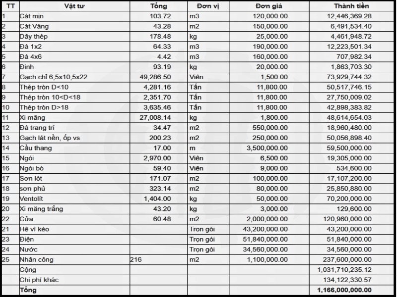 * Trường hợp đổ bê tông mái bằng và mái dốc, chi phí là: 1.282.600.000,00