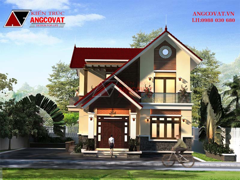 Lấy cảm hứng từ kết cấu mái thái, cùng với một chút biến tấu đã tạo nên thiết kế độc đáo cho kiểu dáng mái của mẫu nhà vuông 2 tầng đẹp ở nông thôn kinh phí 1,2 tỷ đồng. Khối mái chính vẫn tuân thủ tuyệt đối hình dáng mái thái xuôi chiều cân đối về 2 bên. Ngoài ra còn thiết kế các khối mái con, xếp tầng giật cấp.