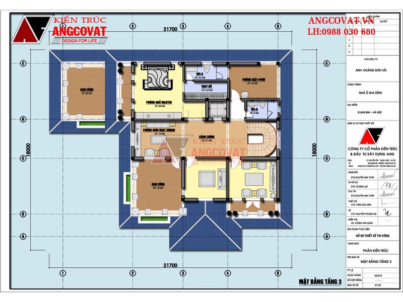 +) Tầng 3: Sảnh chính: 21m2, Phòng sinh hoạt chung 14m2, Ban công 18m2, Phòng thờ: 13m2, Phòng Karaoke: 15m2, Phòng ngủ: 24m2, PHòng thay đồ; 6.4m2, WC5: 5.2m2, Phòng giặt phơi: 13m2, WC6: 5m2, Ban công: 20m2