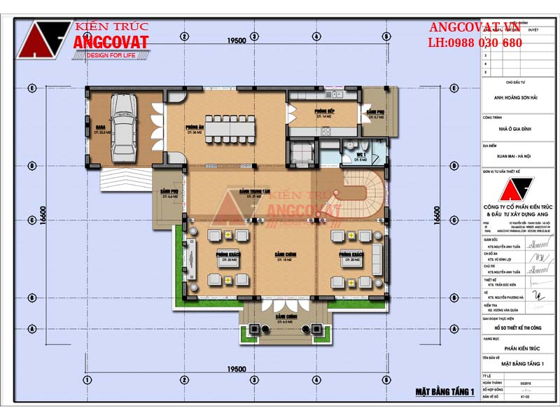 +) Tầng 1: Sảnh chính 6.5m2, Sảnh chính 18m2, Phòng khách 40m2 ( 2 bên sảnh chính) Sảnh trung tâm: 20m2, Sảnh phụ phòng ăn: 6.6m2, Phòng bếp 14m2, Sảnh phụ 5.7m2, WC1: 5m2, Phòng ăn: 36m2, Gara ô tô: 22.6m2.