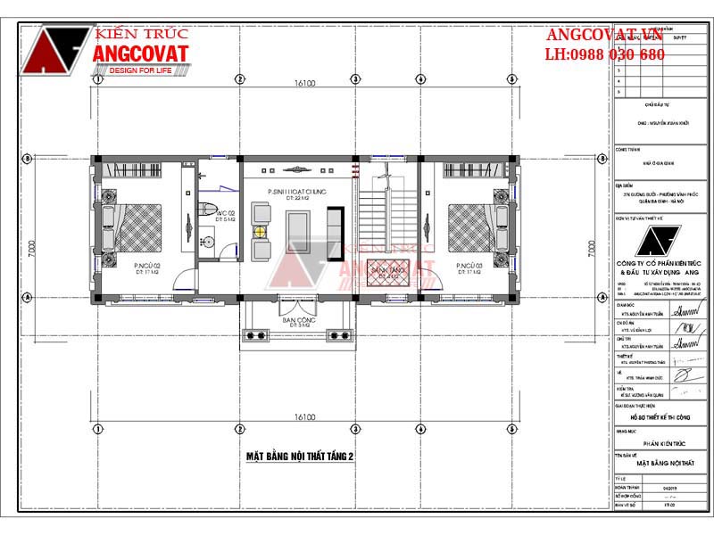 + Tầng 2: Ban công 3m2, phòng sinh hoạt chung 22m2, sảnh tầng 4m2, phòng ngủ 2 17m2, phòng ngủ 3 17m2, wc2 5m2.