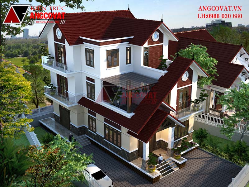 Mẫu số 1: Mẫu thiết kế biệt thự 3 tầng 130m2 mái thái 4 phòng ngủ BT321098