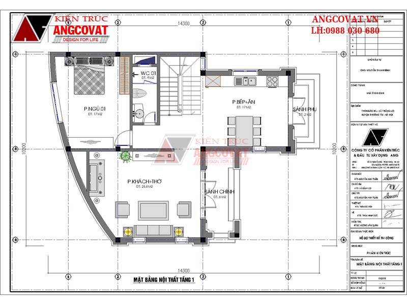 + Tầng 1: Sảnh chính 6m2, Phòng khách+thờ: 25.5m2, Phòngbếp ăn: 17m2, Phòng ngủ 1: 17m2, WC1: 4m2, sảnh phụ: 2m2