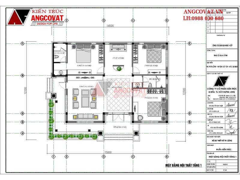 Bước qua bậc tam cấp và bộ phận tiền sảnh sẽ là không gian sảnh chính rộng 19m2, bộ phận sảnh chính là cơ sở để phân chia các phòng chức năng khác trong nhà như phòng khách, phòng ngủ, phòng thờ… Bên trái sảnh chính là phòng khách rộng 24.5m2, phòng khách được bố trí bàn ghế hình chữ U đem đến không gian tiếp khách rộng rãi và thoải mái cho gia chủ. Phòng khách còn được bố trí kệ ti vi và có cửa đi ra hành lang bên ngoài rất tiện lợi. Từ sảnh chính đi thẳng vào là phòng thờ rộng 8.5m2. Phòng thờ được đặt ở vị trí gian giữa của ngôi nhà mang đặc trưng của kiểu nhà cấp 4 truyền thống. Không gian thờ cúng được đặt ở chính giữa của ngôi nhà thể hiện sự tôn nghiêm và tấm lòng thành kính của con cháu đối với ông bà, tổ tiên. Bên trái phòng thờ là phòng ngủ 1 với 16.5m2 được thiết kế nhà vệ sinh khép kín vô cùng tiện lợi, đây sẽ là không gian sống vô cùng thoải mái của chủ nhà. Phòng ngủ 2 và phòng ngủ 3 được đặt ở cùng 1 bên của ngôi nhà và sử dụng phòng vệ sinh chung ở giữa, đây sẽ là không gian sinh hoạt, nghỉ ngơi dành cho những đứa con của gia chủ. Riêng phòng bếp được thiết kế một không gian riêng rộng 43m2 nối tiếp với không gian của nhà chính. Đây là yêu cầu của gia chủ bởi vì phù hợp với lối sống sinh hoạt ở quê. Nhà bếp có thể sử dụng để nấu ăn bằng bếp củi hoặc bằng bếp gas. Ngoài ra, nhà bếp rộng còn có thể chứa các đồ đạc khác như xe máy…