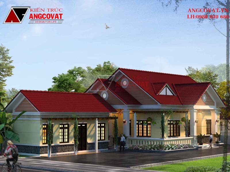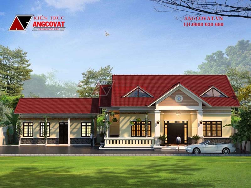 Vẻ đẹp kiến trúc truyền thống của mẫu nhà cấp 4 trệt 3 phòng ngủ 160m2 còn được thể hiện trong hình dáng của ngôi nhà. Trong kiến trúc nhà truyền thống thì hình dáng nhà phổ biến như: nhà chữ Đinh, nhà chữ Công, nhà chữ nhất… và ngôi nhà cấp 4 trên đây nổi bật với hình chữ nhất nằm ngang với hai mái trước và sau theo kiểu thu hồi bít đốc. Ngôi nhà còn nổi bật với mái ngói đỏ tươi, màu sắc quen thuộc trong kiến trúc truyền thống. Tuy nhiên, điều khác biệt của mẫu nhà cấp 4 trên đây đó là kiến trúc sư đã sử dụng mái chữ A cho phần mặt tiền và 2 bên của ngôi nhà để tạo điểm nhấn, làm cho ngôi nhà có sự cách tân so với kiến trúc mái truyền thống.