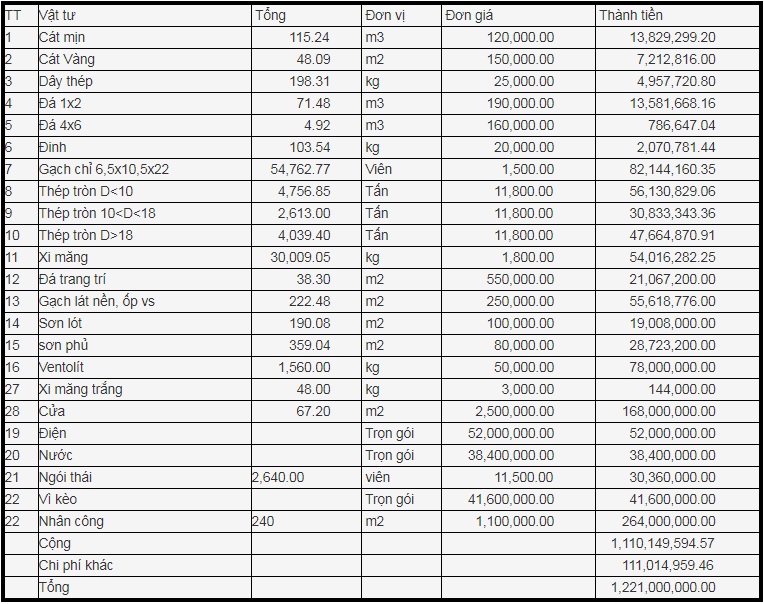 + Đơn giá vật tư ở mức hoàn thiện trung bình