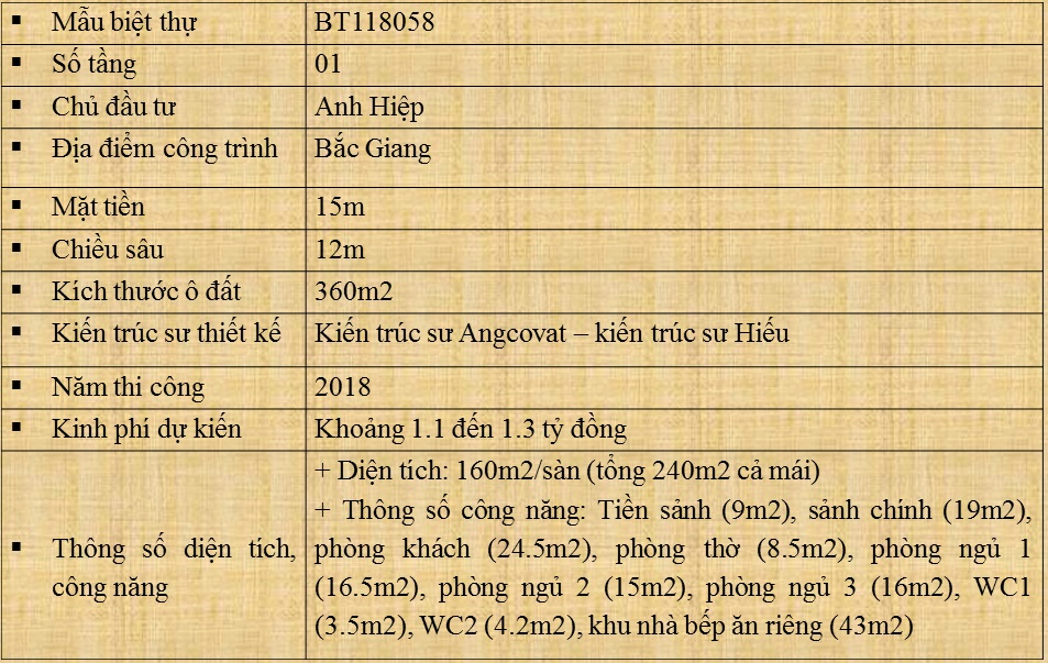 Trên đây là thông số cơ bản về mẫu nhà cấp 4 trệt 3 phòng ngủ 160m2 ở nông thôn được kiến trúc sư của chúng tôi thiết lập dựa trên hiện trạng lô đất và nhu cầu sử dụng của gia chủ. Dựa vào bảng thông tin trên đây chúng ta có thể biết được kích thước của ngôi nhà, kích thước ô đất để xây dựng, chi phí đầu tư và thông số tiện tích, công năng của ngôi nhà. Mỗi một ngôi nhà sẽ có những cách bố trí công năng khác nhau sao cho phù hợp với diện tích và nhu cầu sử dụng của gia đình.