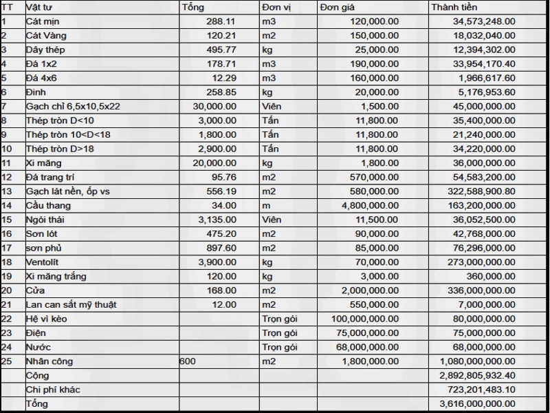 + Trường hợp đổ bê tông mái bằng và mái dốc, chi phí là: 3.977.600.000,00
