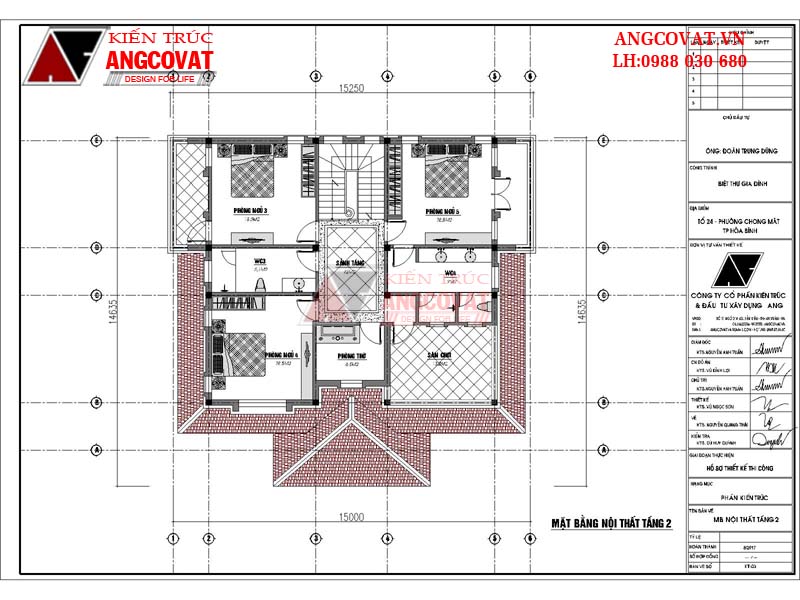 Mặt bằng công năng tầng 2 mẫu thiết kế nhà 2 tầng mặt tiền 15m với hệ thống 3 phòng ngủ tiện nghi