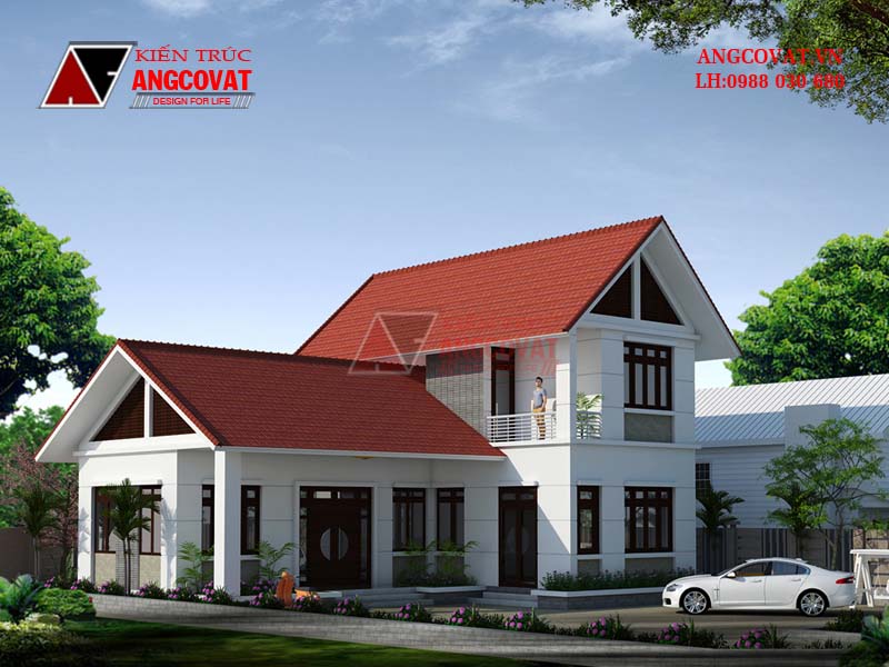 Thiết kế biệt thự mặt tiền 15m mái dốc mang đậm chất truyền thống với kết cấu 3 gian thuộc cung cát. Từ màu sắc (màu ngói đỏ, cửa nâu gỗ), đến hình khối, chi tiết trang trí đều thể hiện sự cân đối, hài hòa.