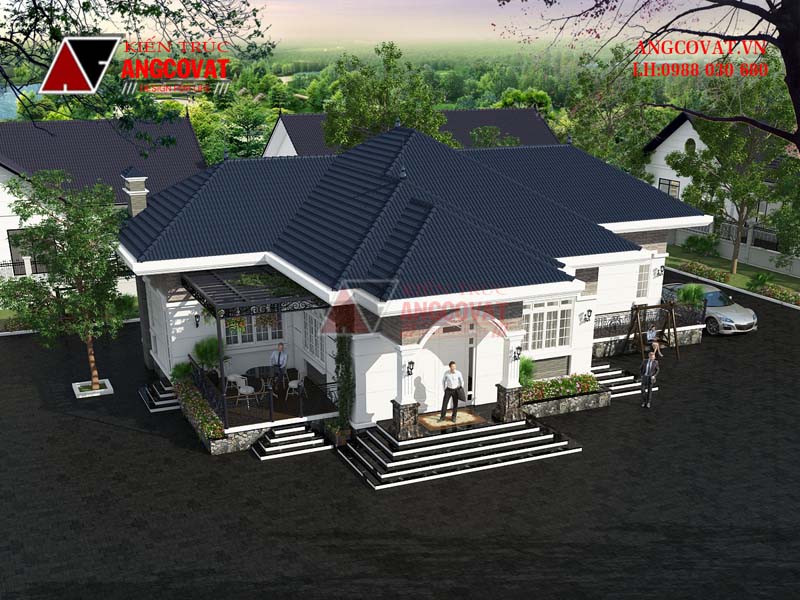 Phối cảnh thiết kế biệt thự có mặt tiền rộng mái thái diện tích 230m2