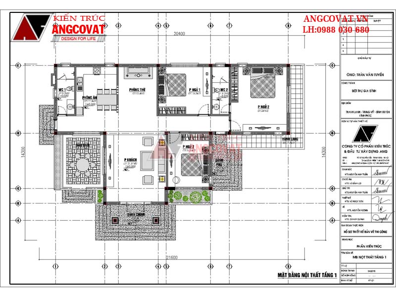 Thông số công năng, diện tích: Sảnh chính 6m2, Phòng khách 24m2, Phòng ăn 21m2, Phòng bếp 10m2, Sân chơi 18m2, Phòng thờ 18m2, Phòng ngủ 1 15m2, Phòng ngủ 2 24m2, WC2 5.3m2, Phòng ngủ 3 18.7m2, WC2 4m2, Hành lang rộng 1.2m2.