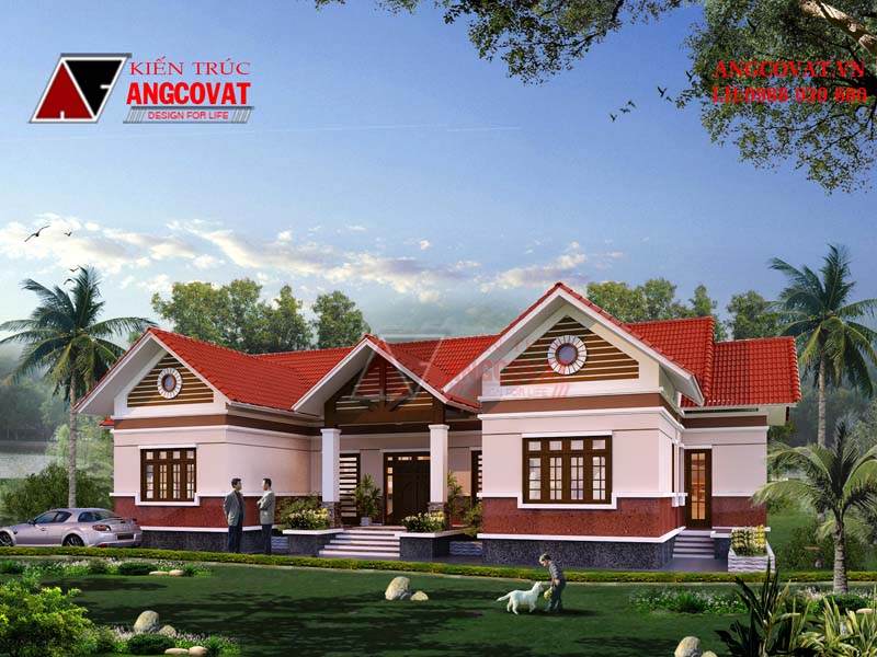 Tạo hình mặt đứng lạ mắt cho thiết kế nhà trệt cấp 4 mái thái đẹp 3 phòng ngủ 1 phòng thờ