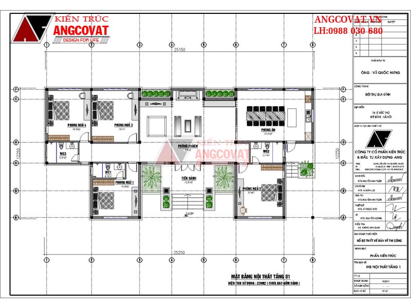 Thông số công năng, diện tích: phòng khách: 25m2, phòng bếp+ăn 25m2, sảnh chơi 9.5m2, sảnh chính 17m2, thờ 14m2, ngủ 1 18.8m2, ngủ 2 14.6m2, ngủ 3 14.6m2 ngủ 4 17.3m2.