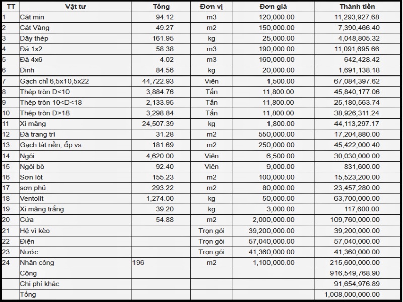 * Chi phí khác như đào móng, lấp móng, ép cọc, phát sinh thi công,... được tính bằng 10-15% chi phí tổng