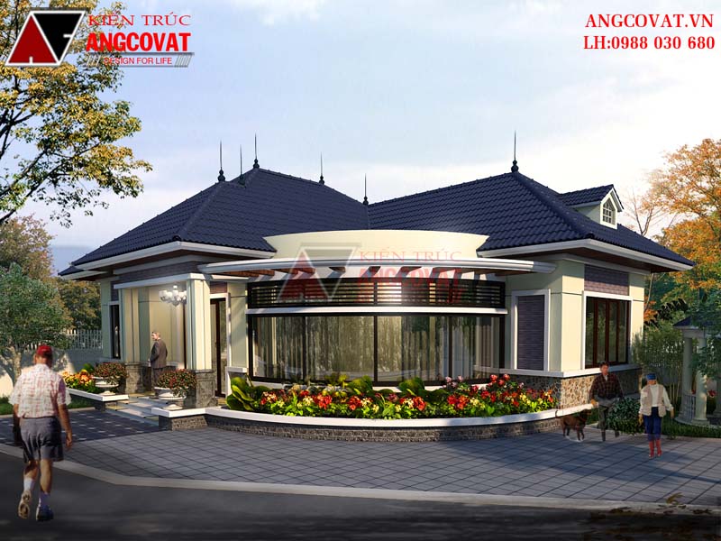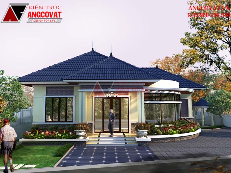 - Lựa chọn kiểu mái thái, ngói xanh. Cửa sử dụng chất liệu kính đón sáng tự nhiên.