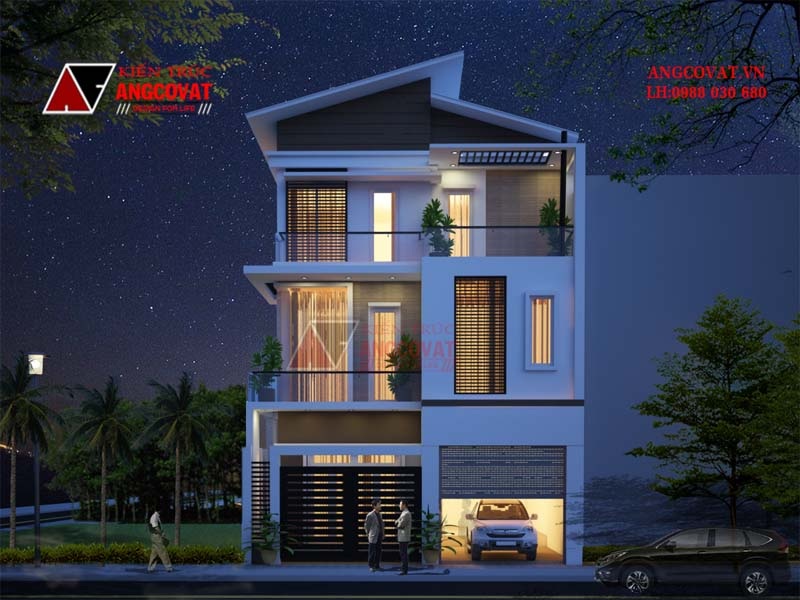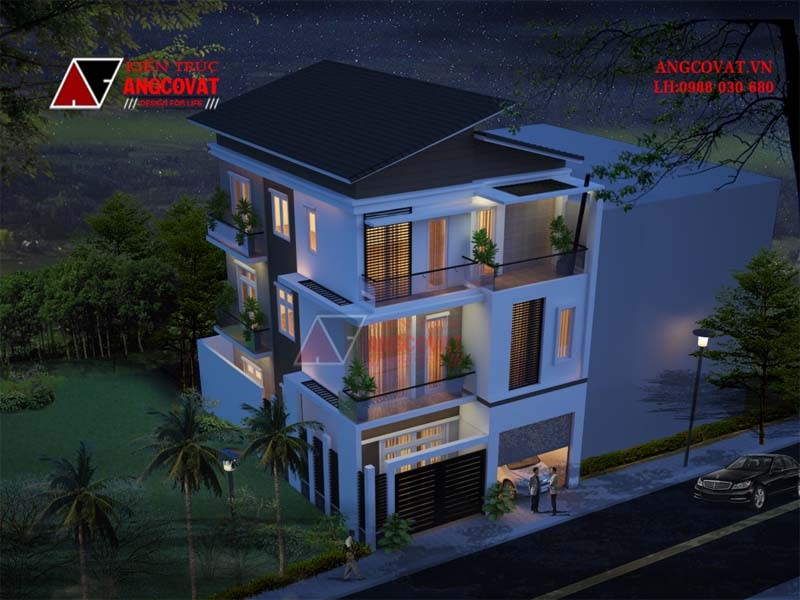 Phối cảnh: Bản vẽ kích thước nhà biệt thự 3 tầng 9x12m đẹp vào ban đêm