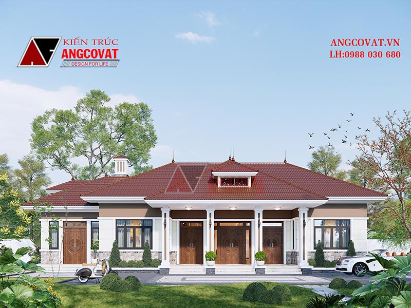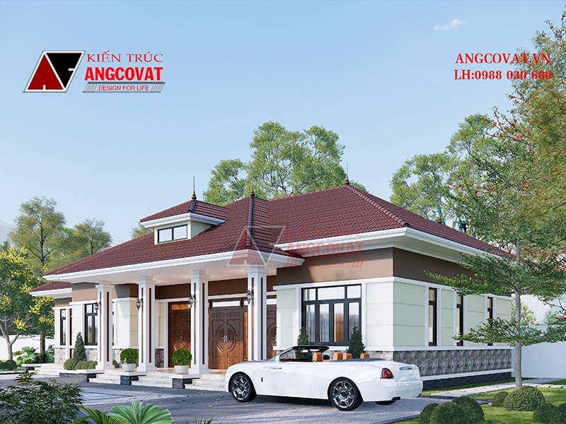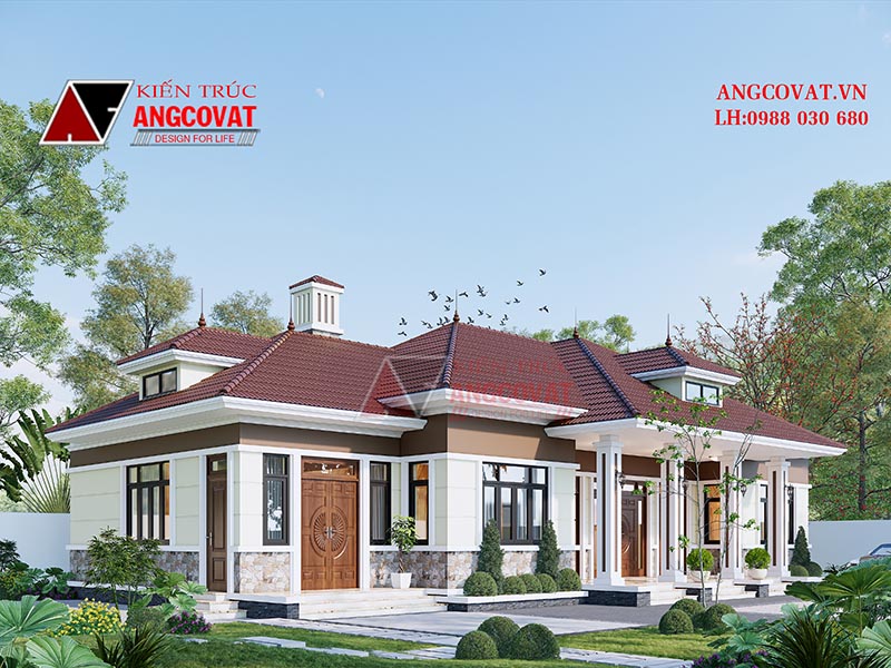 Hệ mái của mẫu biệt thự nhà vườn 1 tầng được kiến trúc sư thiết kế theo kiểu mái thái- một trong những kiểu mái phổ biến và được ưa chuộng hiện nay. Có thể tham khảo các công trình với thiết kế mái đẹp tại: Nha mai thai
