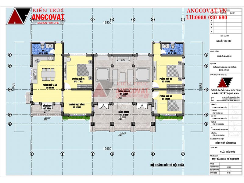 11.Thông số công năng diện tích: Sảnh chính 21m2, Phòng khách 44m2, Phòng đọc sách 12m2, sảnh phụ 5m2, Phòng bếp ăn: 23m2, WC1: 4,2m2, Phòng ngủ 1: 17m2, Phòng ngủ 2: 12m2, Phòng ngủ 3: 17m2, WC2: 4.1m2.