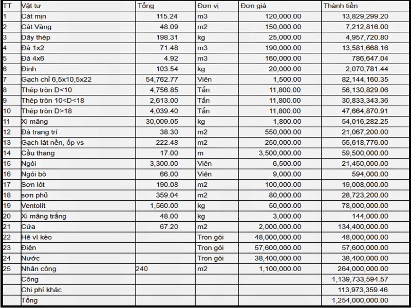 * Chi phí khác: đào móng, lấp móng, ép cọc, phát sinh thi công,.. được tính bằng 10-15% chi phí tổng
