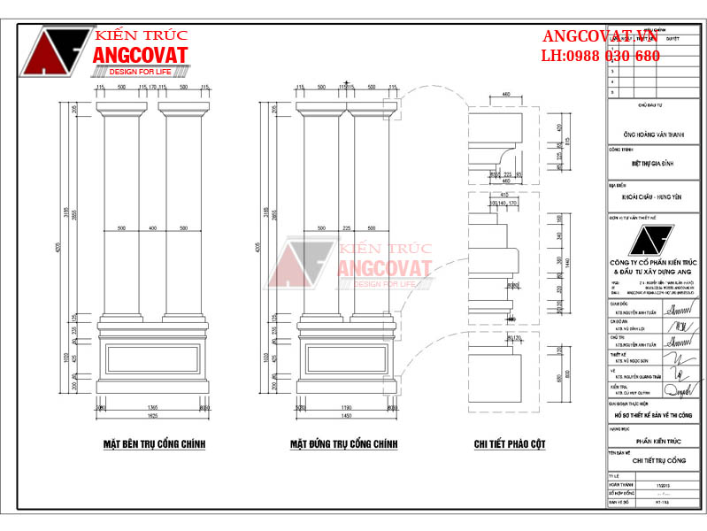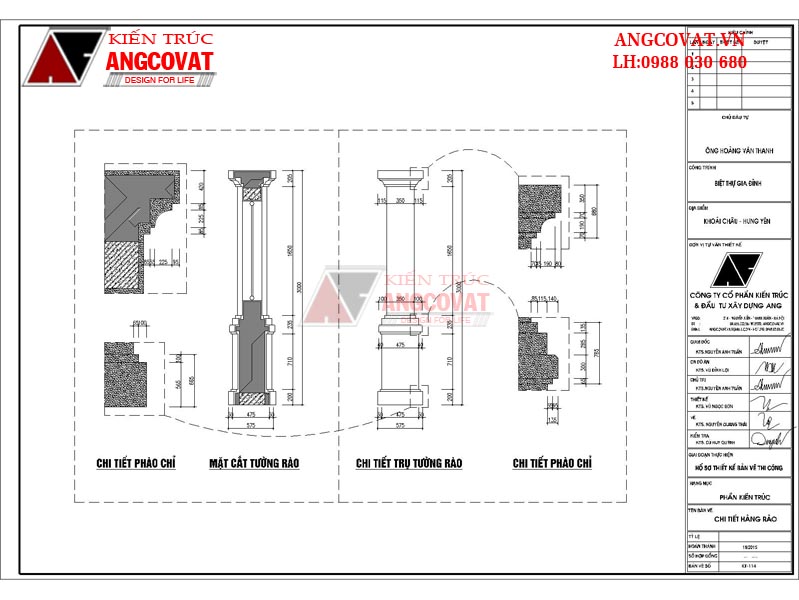 - Bản vẽ thiết kế trụ cổng bao gồm chi tiết mặt bên trụ cổng chính, mặt đứng trụ cổng chính, chi tiết phào cột hoa văn trang trí sử dụng trong thiết kế và xây dựng cổng, hàng rào.