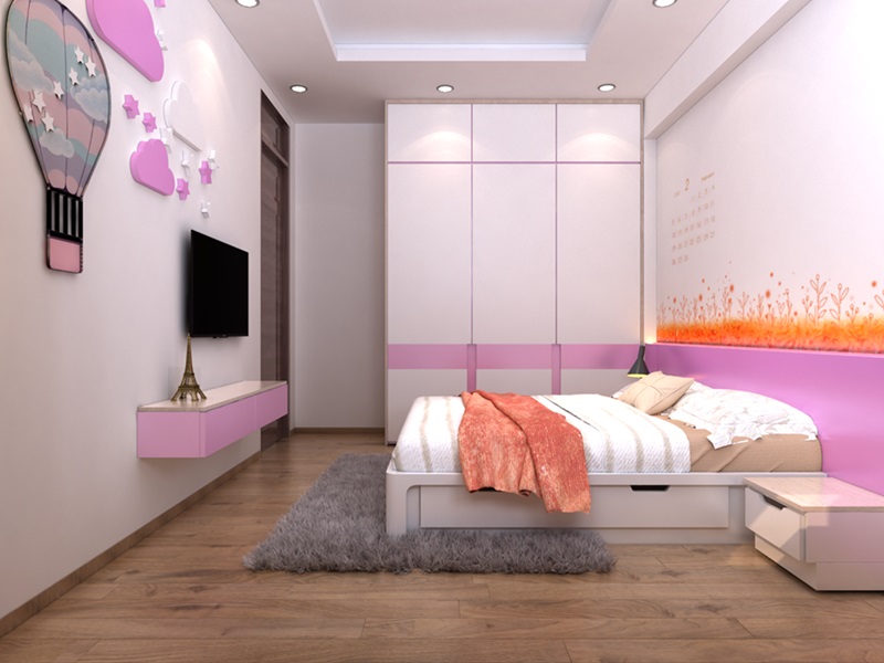 Phòng nhỏ cũng hóa to nhờ có sự kết hợp giữa các biện pháp bố trí đồ đạc nội thất thông minh. Đối với giường ngủ dạng gấp, bạn hoàn toàn có thể tận dụng để làm không gian sàn nhà để cho con cái chơi đồ hàng và bày bừa khi nâng giường lên còn tủ âm tường 2 cánh thiết kế ngay 2 bên đầu giường vừa tiện lợi vừa tiết kiệm không gian vừa đẹp mắt, khi nâng giường lên sẽ tạo thành mặt phẳng, bất kì ai cũng hài lòng với cách thiết kế này.