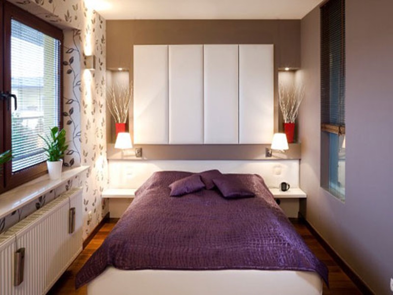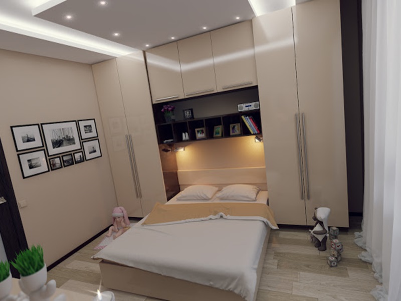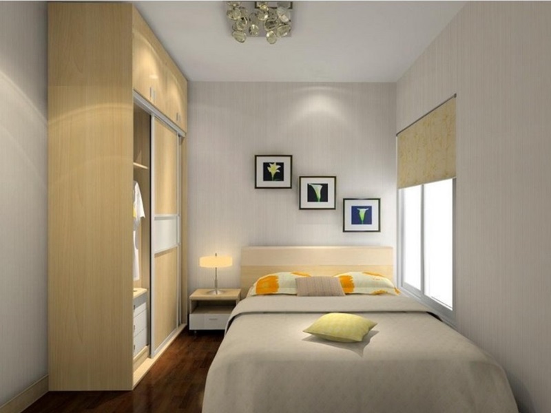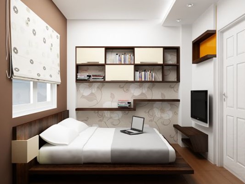 Đối với những phòng ngủ nhỏ hẹp chỉ như một phòng trọ thì việc bố trí nội thất không phải chuyện dễ dàng vì không thể đặt được nhiều đồ đạc kích thước lớn mà chủ đầu tư nên cân nhắc chỉ đặt những vật dụng cơ bản cần thiết kế tạo sự thoáng rộng. Trong mặt bằng đã có sự gợi ý những vật dụng đó là giường ngủ, tivi gắn tường ở đối diện giường, tủ quần áo, bàn làm việc nhỏ kèm theo ghế và một hộc tủ đựng đồ. Ngoài ra có thể thiết kế thêm kệ gắn tường kiểu hình học để những vật dụng trang trí. Tuyệt đối không bày nhiều đồ trong không gian phòng ngủ. Thiết kế phòng ngủ 10m2 cho vợ chồng chúng ta nên tham khảo thêm những kiểu phòng ngủ phong cách Nhật Bản sẽ thấy đặc điểm này.