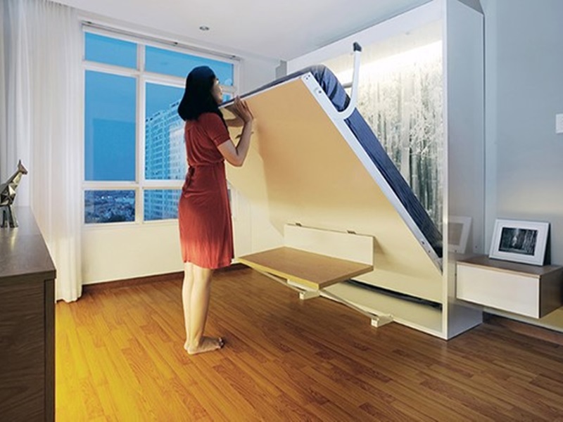 Một biện pháp tối ưu để sử dụng cho một căn phòng ngủ nhỏ đó là dùng các vật dụng nội thất thông minh, tiện lợi có tính giải phòng mặt sàn cao, ví dụ là giường ngủ gấp thông minh. Thiết kế phòng ngủ 10m2 Loại sản phẩm này cho phép bạn tiết kiệm tối đa diện tích sàn với cách thiết kế âm tường khi nâng lên và lúc hạ xuống thành giường ngủ rất hiện đại. Việc nâng lên hạ xuống khá nhẹ nhàng bạn cũng không cần mất nhiều công sức. Ban ngày bạn nâng giường ngủ lên ốp vào tường còn khi nào muốn nghỉ ngơi lại hạ xuống.