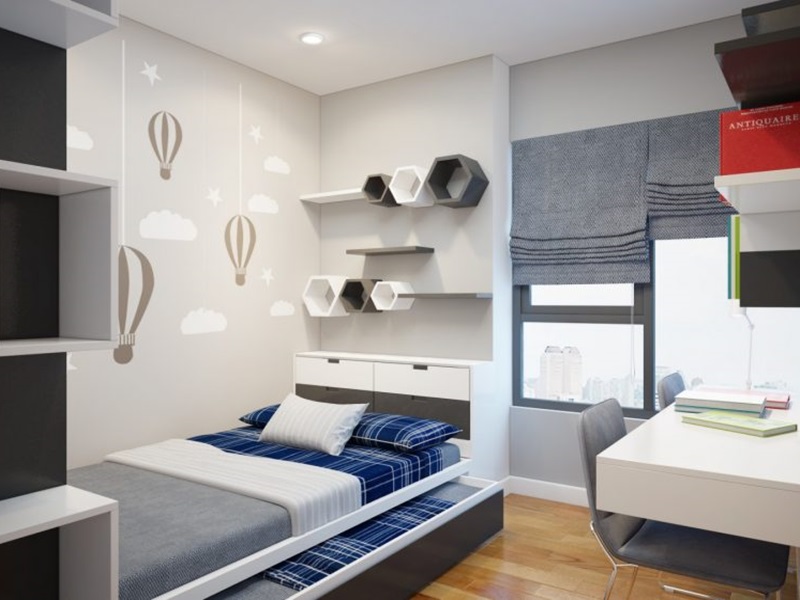 Tận dụng chiều cao tường để gắn các kệ nhỏ là cách trang trí rất đẹp mắt và thông minh cho những căn phòng ngủ nhỏ. Để tạo nên tính thẩm mĩ và sang trọng khi thiết kế phòng ngủ 10m2 cho vợ chồng, chúng ta có thể sử dụng những kệ trang trí hình đa giác gắn tường vừa tạo sự tinh tế, ấn tượng vừa không tốn diện tích . Tận dụng chiều cao tường đặt sách truyện hoặc những vật trang trí nhỏ trên kệ là cách trang trí phổ biến và hữu dụng cho ngôi nhà nhỏ của bạn.