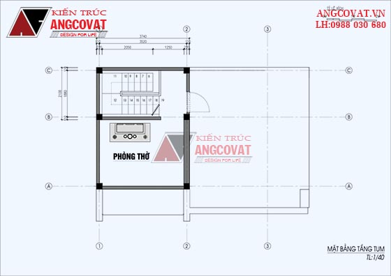 Mặt bằng tầng áp mái của ngôi nhà phố 3 tầng được sử dụng làm phòng thờ và có lối đi ra sân thượng, phòng thờ được đặt ở vị trí cao nhất trong ngôi nhà là hoàn toàn hợp lí tránh được các tác động từ môi trường xung quanh.