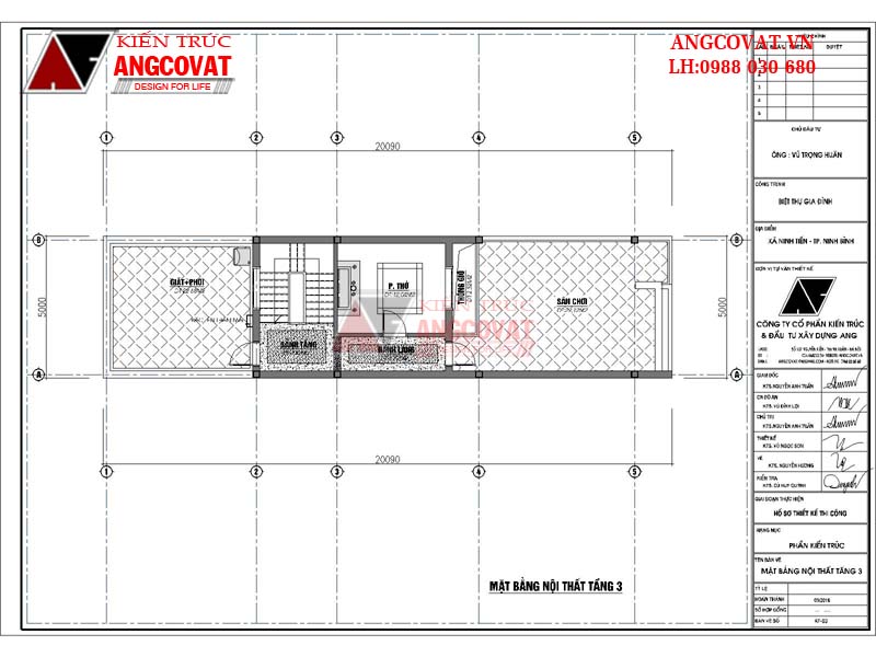 Không gian tầng 3 chủ yếu dùng cho phòng thờ, sân chơi và nơi giặt phơi, phần không gian còn lại dành cho sảnh tầng, hành lang và thông gió. Không gian phòng thờ đặt ơ tầng 3 là hợp lí nhất bởi vì đây là vị trí cao nhất của ngôi nhà, không bị quấy nhiễu, ảnh hưởng của các hoạt động sinh hoạt thường ngày và cũng không ảnh hưởng đến không gian nghỉ ngơi của gia đình.
