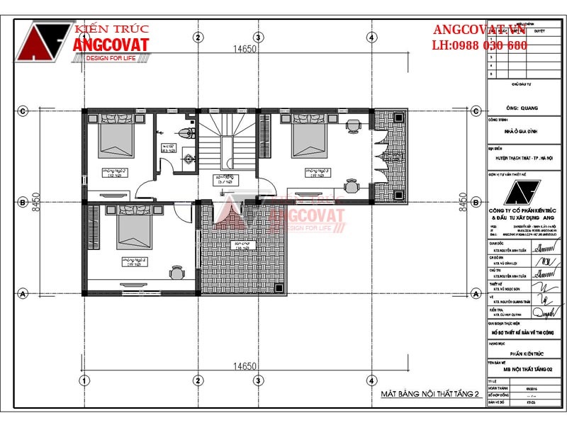 Tầng 2 chủ yếu là không gian riêng tư với 3 phòng ngủ và 1wc chung. Đối với các phòng ngủ đều được bố trí khá rộng rãi và xử lý ánh sáng, thông gió tự nhiên khoa học, hợp lý, hệ thống cửa sổ ở các phòng đều giúp mang lại sự thoáng đãng thiết yếu cho mẫu nhà 2.5 tầng đơn giản 100m2. Mặt bằng tầng tum được bố trí sân phơi và 1 phòng thờ.