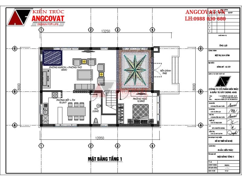 Với diện tích hơn 100m2, mặt bằng được thiết kế theo nhu cầu của chủ đầu tư. Tầng 1 ngôi nhà được thiết kế với mặt tiền 8m sâu 12m được thiết kế 2.5 tầng các không gian phòng được bố trí rất hàu hòa như 1 phòng ngủ 13m2, 1 phòng khách kết hợp không gian thờ 45m2, 1 phòng bếp + ăn 15.5m2 , 1 sảnh và 1 phòng vệ sinh khép kín trong phòng bếp diện tích 3.5m2.