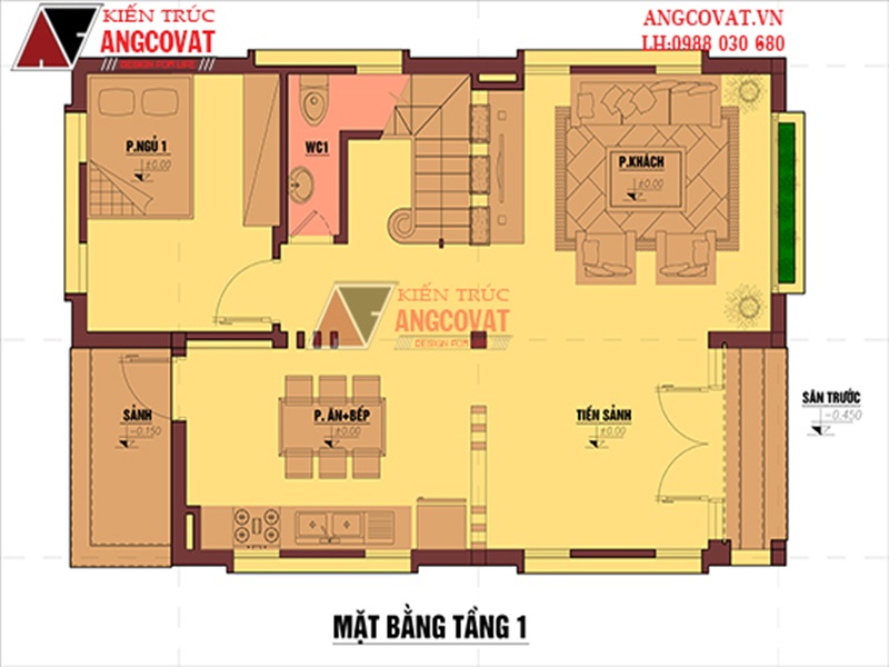 Tầng 1 gồm các không gian chức năng cơ bản như phòng khách, phòng bếp ăn, 1 phòng ngủ và wc chung. Đối với một mẫu nhà 2.5 tầng đơn giản kiểu nhà phố thì chỉ cần diện tích khoảng 80m2 đến 120m2 là đã khá rộng rãi và tiện nghi phù hợp với nhu cầu sử dụng của hầu hết các gia đình.
