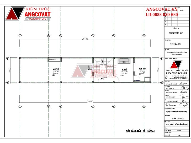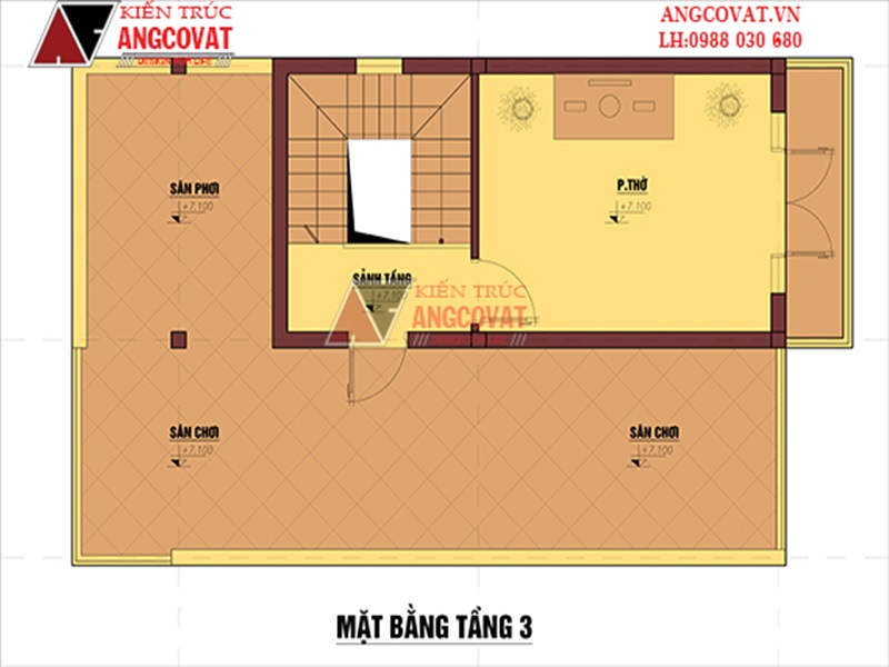 Tầng 3 là không gian dành cho phòng thờ, sân chơi và sân phơi. Phòng thờ là nơi trang nghiêm, là nơi để con cháu hành lễ nhớ về cội nguồn trong những dịp giỗ chạp, ngày lễ, tết. Vì thế nên việc đặt riêng phòng thờ và ở trên cao là rất cần thiết. Ngoài ra còn có sân chơi là nơi để con cháu vui chơi và là nơi trồng cây cảnh hoặc trồng rau sạch.