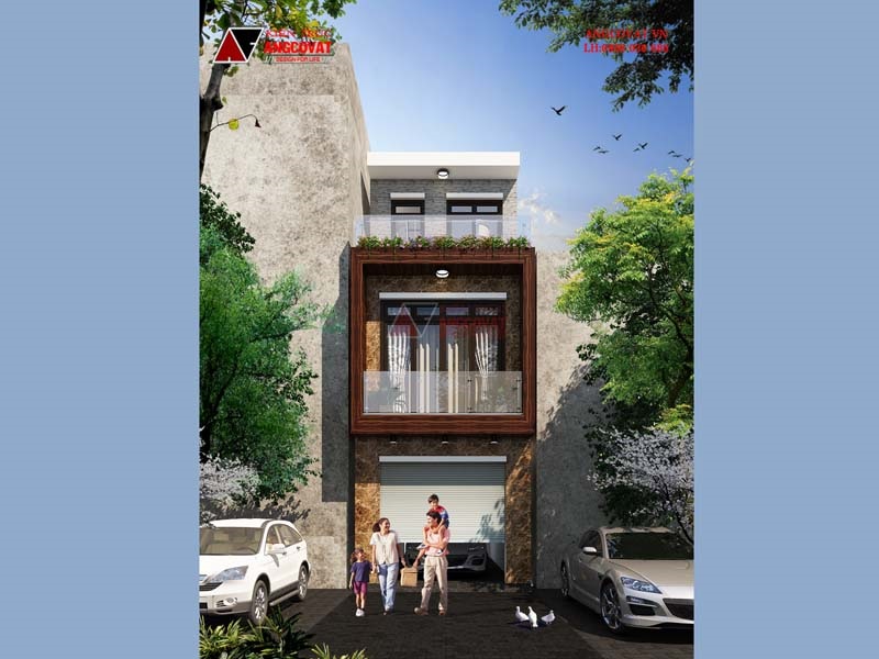 Mẫu thiết kế nhà 2.5 tầng đơn giản mặt tiền 4m được xây dựng trên lô đất 80m2 với chi phí đầu tư dự kiến khoảng 1,1 tỷ đồng của gia đình anh Nguyễn Công Quý ở Sóc Sơn do kiến trúc sư Angcovat thiết kế. Mẫu biệt thự đẹp được thiết kế theo kiến trúc nhà phố hiện đại nhấn mạnh vào hình khối, mảng miếng mang tính hình học, khỏe khoắn, vuông vức và ấn tượng. Mặc dù kích thước mặt tiền chỉ có 4m nhưng vẫn nổi bật nhờ cách tạo dựng hình khối đặc sắc của angcovat. Hình khối ngôi nhà phố nhấn mạnh vào khối tầng 2 với mảng cửa sổ đua ra được trang trí bằng viền gỗ sang trọng, lạ mắt. Đặc trưng của những ngôi nhà phố là không gian hẹp và bí bách và thiếu ánh sáng tự nhiên nhưng với cách thiết kế khéo léo thông minh của angcovat chủ đầu tư vô cùng hài lòng về ngôi nhà.