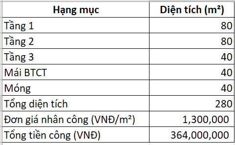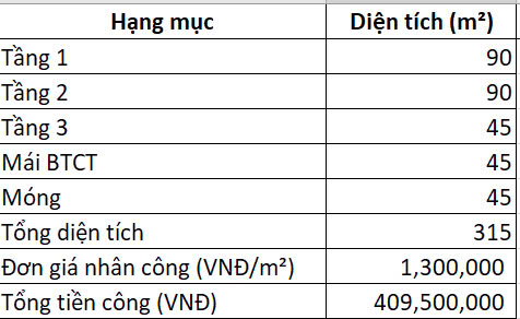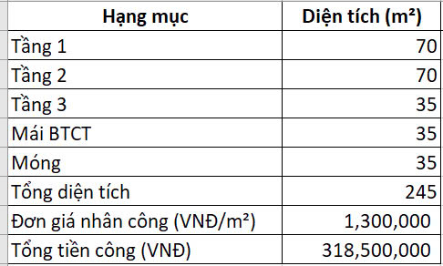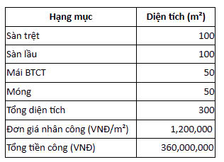 Tiền công = Tổng diện tích xây dựng × Đơn giá nhân công theo m²