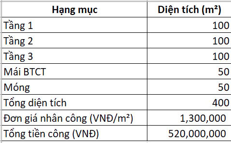 Vậy chi phí tiền công thợ xây nhà 3 tầng 100m2 là 520 triệu đồng.