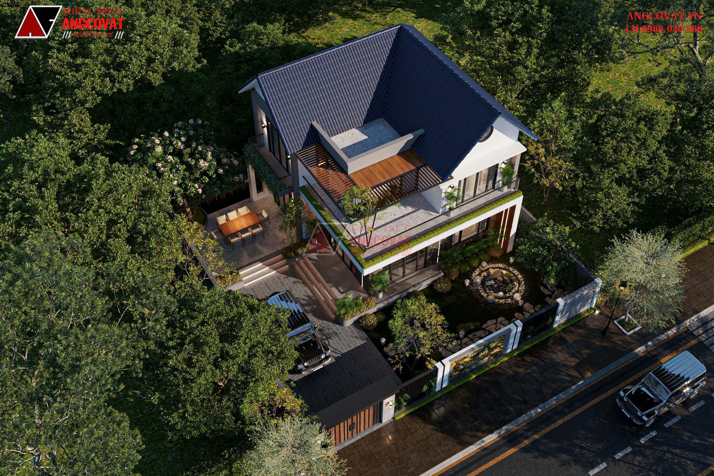 Hệ mái thái sử dụng ngói màu xanh than cao cấp, độ dốc lớn giúp thoát nước nhanh, chống nóng và chống thấm hiệu quả. Đây là kiểu mái rất phù hợp với khí hậu miền Bắc.