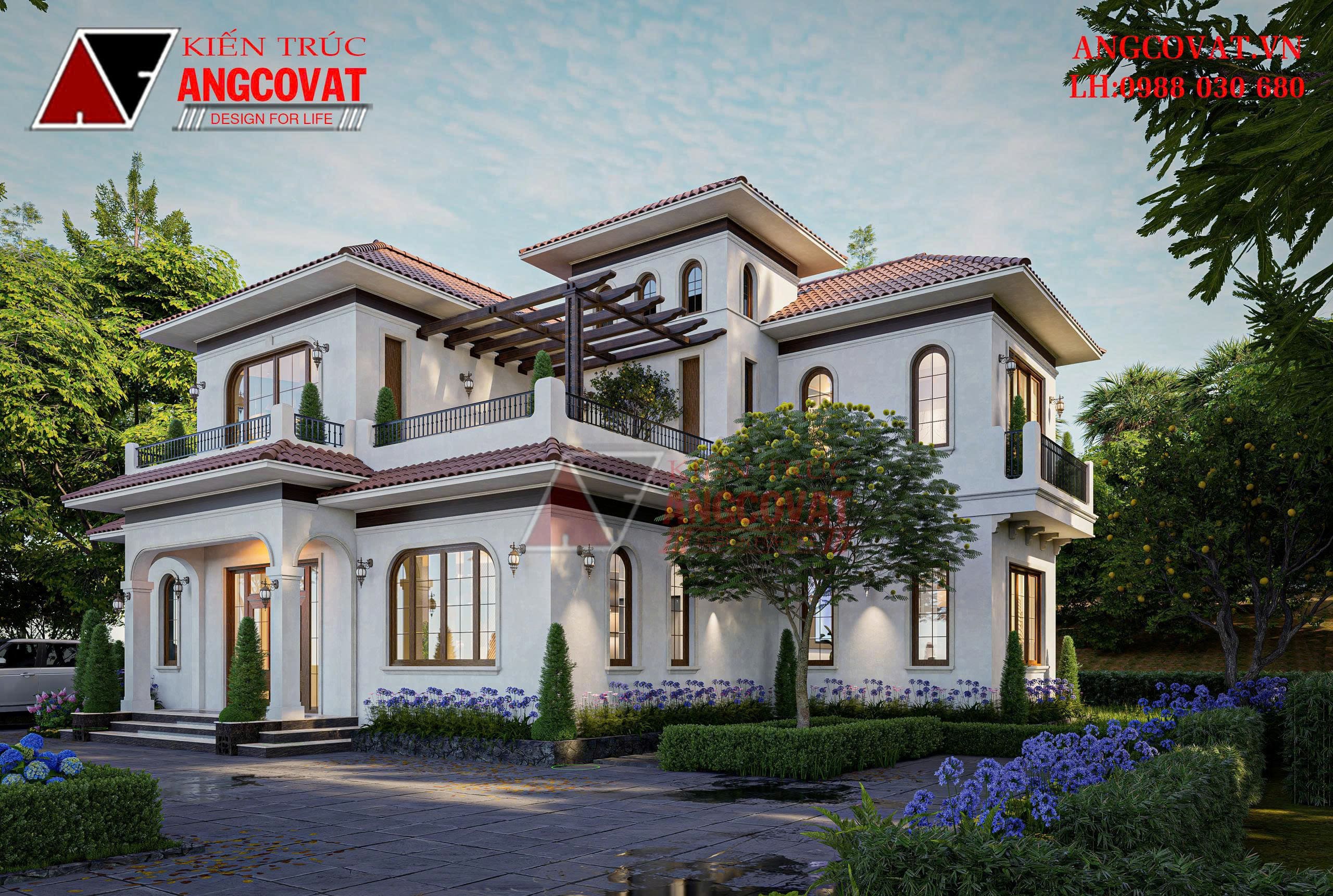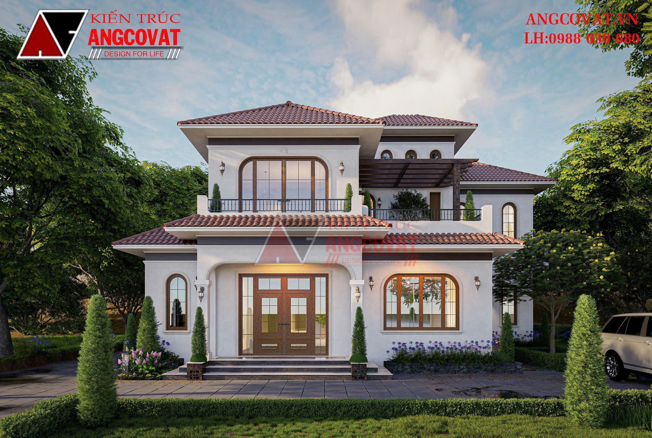 Phong cách Địa Trung Hải trong mẫu nhà này được thể hiện rõ qua hệ mái ngói đỏ đất nung, các ô cửa vòm mềm mại, ban công rộng và khu sân chơi ngoài trời ở tầng 2. Tất cả tạo nên một không gian sống vừa sang trọng vừa gần gũi, mang hơi hướng nghỉ dưỡng cao cấp.