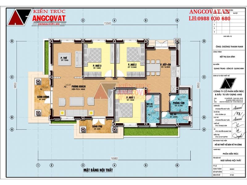 Thông số các phòng: sảnh chính: 6m2; phòng khách: 30m2; phòng thờ: 13m2; sảnh phụ: 5m2; phòng ngủ 1: 13m2; phòng ngủ 2: 12.5m2; phòng ngủ 3: 13m2; wc1: 5m2; wc2: 3.8m2; phòng tắm: 4.1m2; bếp ăn: 16.5m2