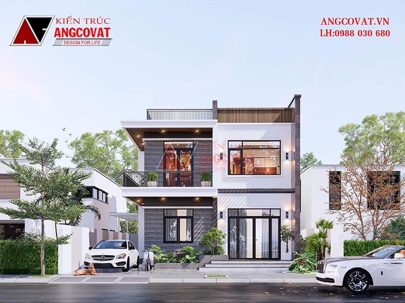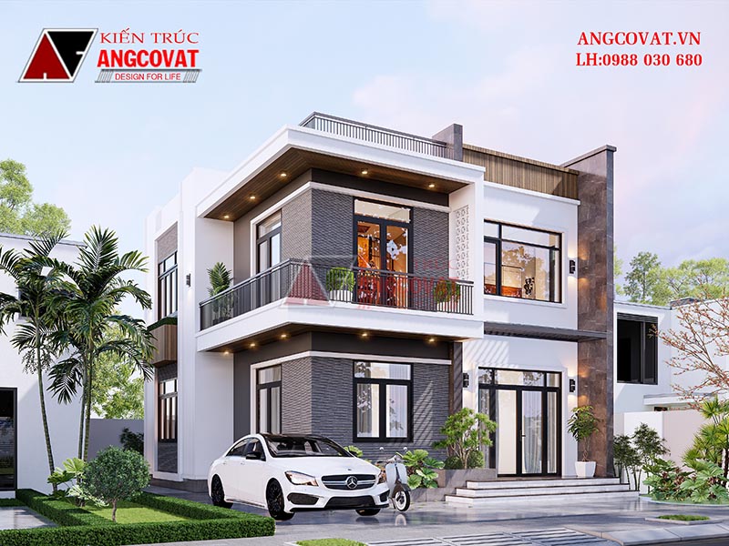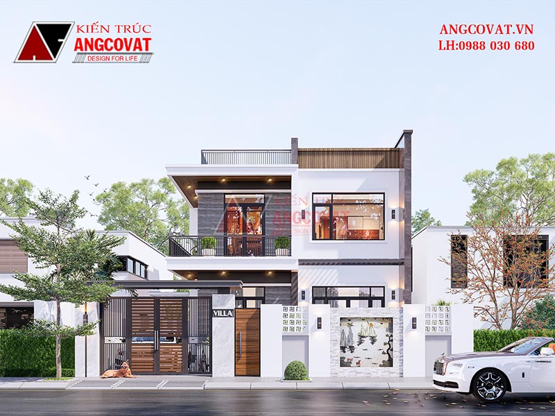 Trên mảnh đất 16m x 18m, mẫu biệt thự 2 tầng đẹp với kiến trúc mặt tiền nhẹ nhàng, thể hiện cách bố trí khoa học không gian trong và ngoài nhà của KTS angcovat. Biệt thự hiện đại 2 tầng sử dụng gam màu trắng tinh tế kết hợp ốp gạch thẻ xám nâu ấm áp tạo nên các điểm tương phản, làm cho ngôi nhà thêm chiều sâu và có sự sắc sảo trong nét kiến trúc. Việc sử dụng màu sắc như vậy tạo vẻ đẹp tươi sáng, nhẹ nhàng cho ngôi nhà có nhiều đường nét vuông vức này, khiến nó trở nên hài hòa hơn.