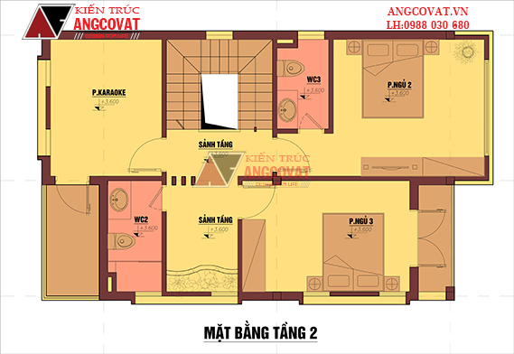 Mặt bằng tầng 2 của mẫu nhà ống 2 tầng 1 tum trên đây cũng có diện tích 112m2 với các phòng chức năng sau: 2 phòng ngủ, 1 phòng karaoke, 2 nhà vệ sinh và sảnh tầng. Việc bố trí công năng như trên làm cho không gian ngôi nhà trở nên thông thoáng hơn, đem đến không gian nghỉ ngơi và thư giãn thoải mái cho các thành viên trong gia đình.