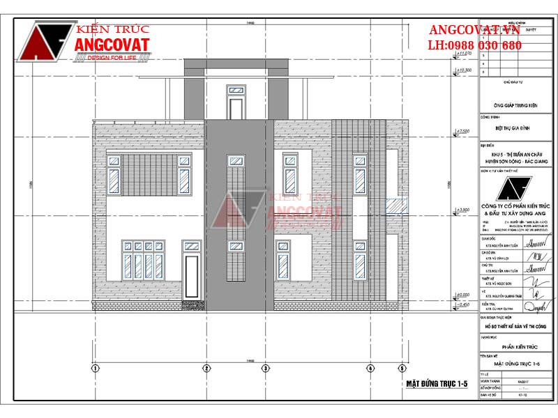 Mặt đứng trục 1 – 5: Mẫu bản vẽ thiết kế nhà ống 2 tầng 1 tum sang trọng, bề thế